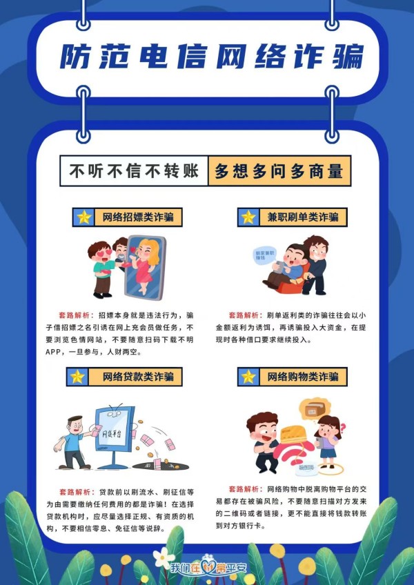 全民反诈,人人有责。其实诈骗就在身旁,时刻提醒自己要坚守:不明链接不点击、遇到转账要三思、不贪小便宜的三要素,捂好自己的钱包、管好自己的密码、对自己负责、对家人负责,积极参加反诈宣传、主动汇报异常情况,才能更好的守住自己的幸福!