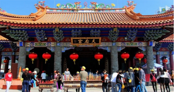 出发的第一天,我们来到了惠州参观巽寮【天后宫】阿妈庙。相传,阿妈庙里面供奉的妈祖神像,原来是供奉在稔山镇范和港的妈祖庙,一次台风海潮后,妈祖神像漂流到巽寮湾,停留在凤池岛的沙滩上。当地渔民十分崇敬妈祖,就在海滩上为她建造了阿妈庙。