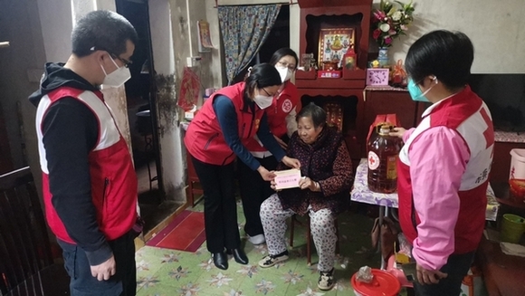 1月10日下午,东莞市红十字会在北隅社区开展了“博爱送温暖”春节慰问活动。活动启动仪式上,市红会常务副会长伍淑筠向高宝慈善代表颁发了捐赠感谢状。仪式结束后,高宝慈善代表携同其他相关志愿者冒着细雨,分组落户走访慰问北隅社区的低保、低收入、特困家庭以及80岁以上居家养老对象等,并为每户困难群众送上慰问金及米、面、油、防疫品健康包等生活物资,祝愿他们过上一个平安、祥和、且温暖的春节!走访中,志愿团代表与困难群众亲切交流、嘘寒问暖,深入了解他们的身体健康状况、日常生活情况及居家安全情况等,提醒他们保重身体,做好防疫措施,遇到困难及时向社区反映,同时也鼓励他们要坚定生活信心。志愿团代表们关心的话语和问候,捂热了困难群众的心,倾城爱心和无限热忱,驱散了冬日的寒冷,受访群众脸上都挂满着幸福的笑容,感激之情溢于言表。
